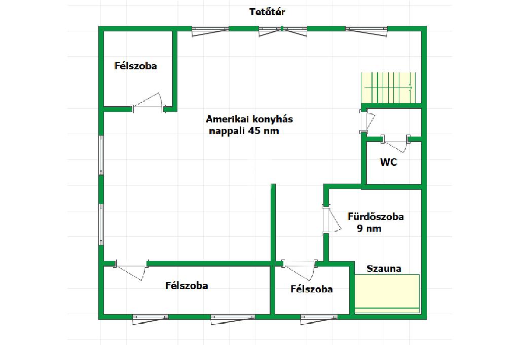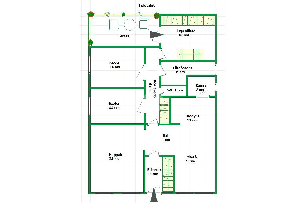 A földszinten található egy nappali, két hálószoba, konyha, kamra, étkező, előszoba, hall, közlekedő, fürdőszoba, külön WC, valamint egy lépcsőház és egy fedett terasz is továbbá a tetőtérben van egy amerikai konyhás világos nappali, három félszoba, egy szaunával felszerelt fürdőszoba és egy WC.