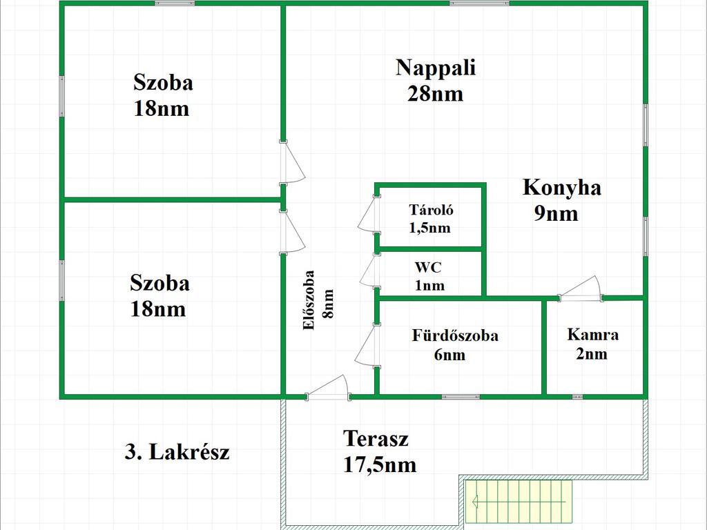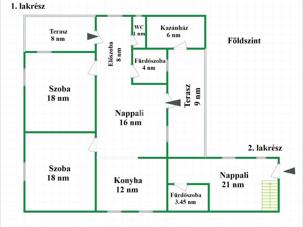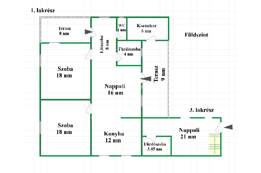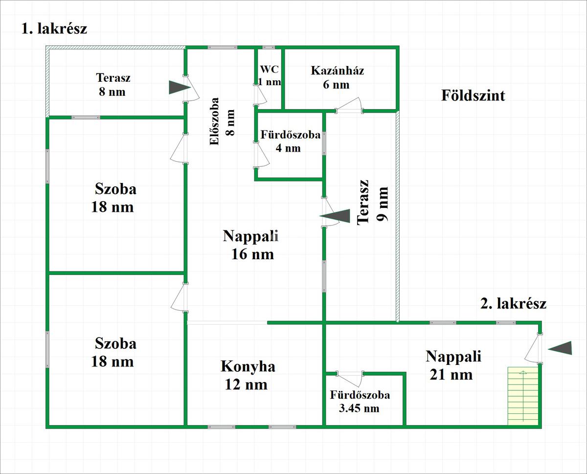 1. Lakrész: nappali+konyha, 2 db szoba, előszoba, fürdőszoba, WC, terasz.
