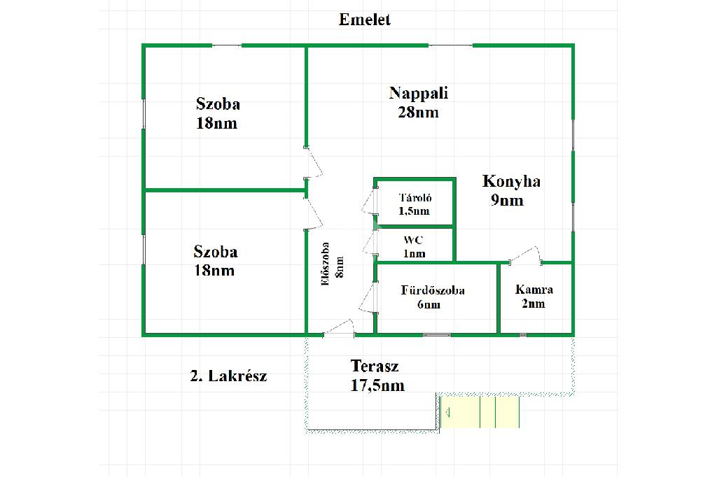 2.Lakrész: amerikai konyhás nappali, 2 db szoba, előszoba, fürdőszoba, kamra, tároló, WC, terasz.