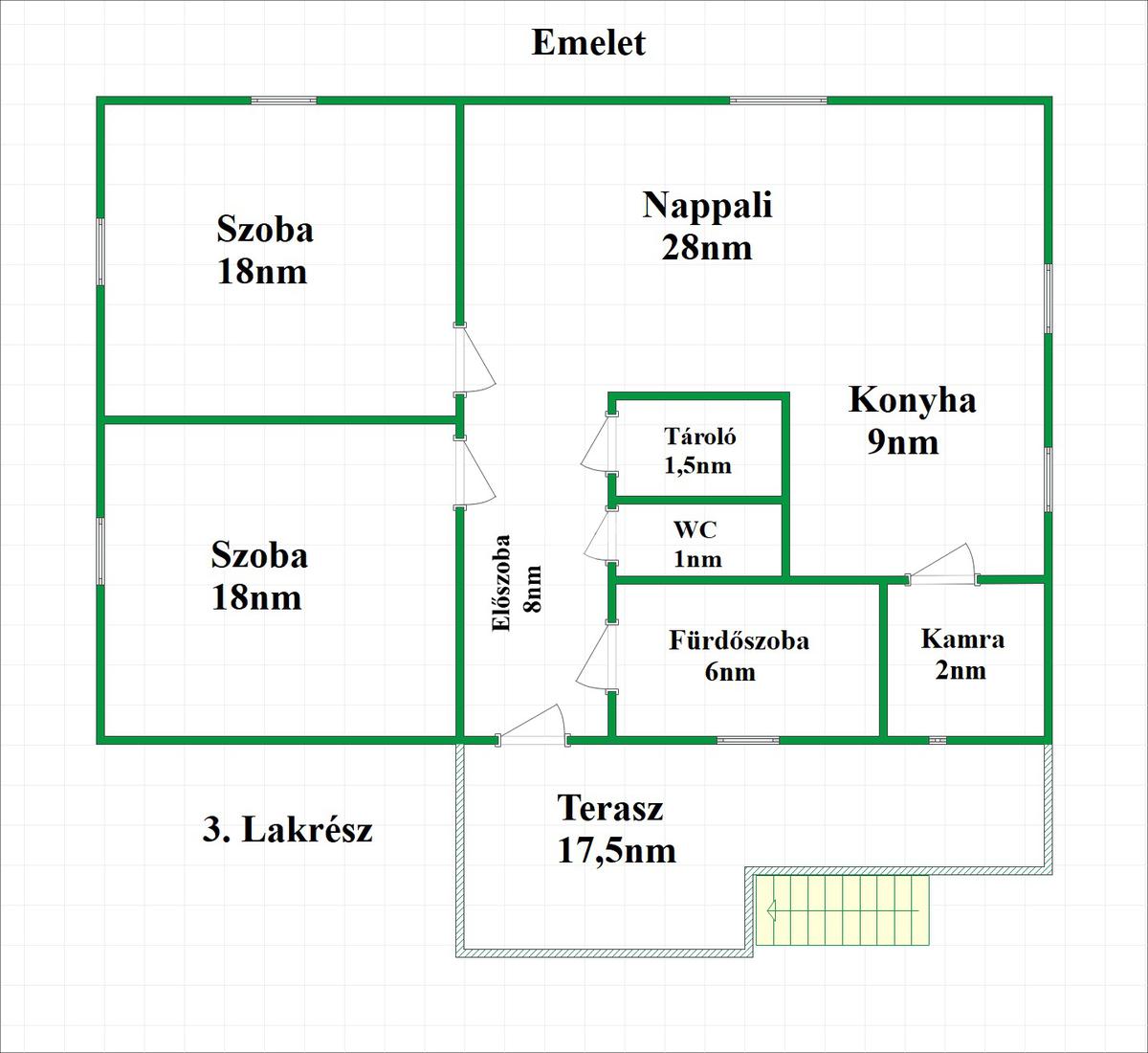 3. Lakrész belső kétszintes: nappali + konyha, fürdőszoba, 1 db szoba (tetőtérben).