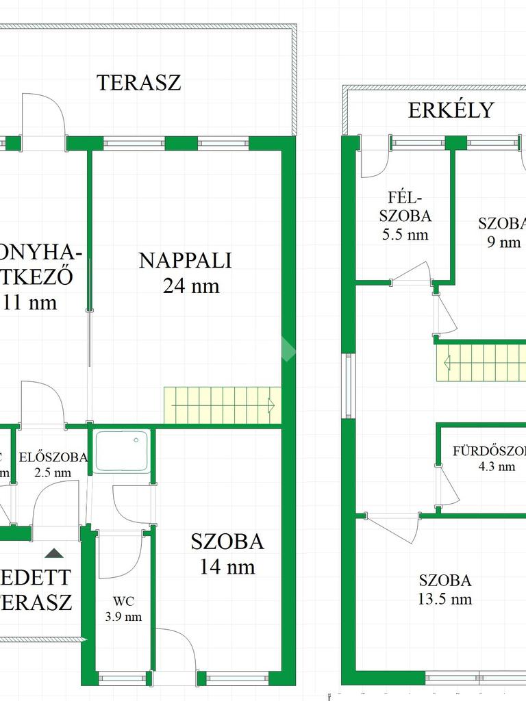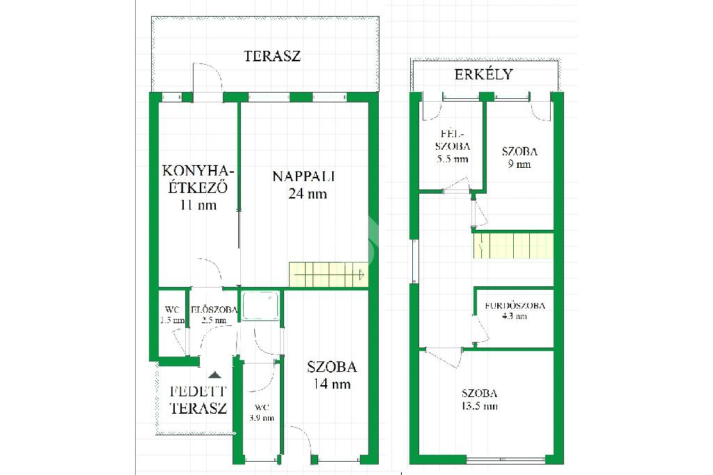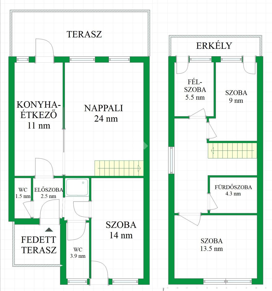 A földszinten tágas nappali, konyha, étkező, hálószoba, fürdő és külön WC kapott helyet.