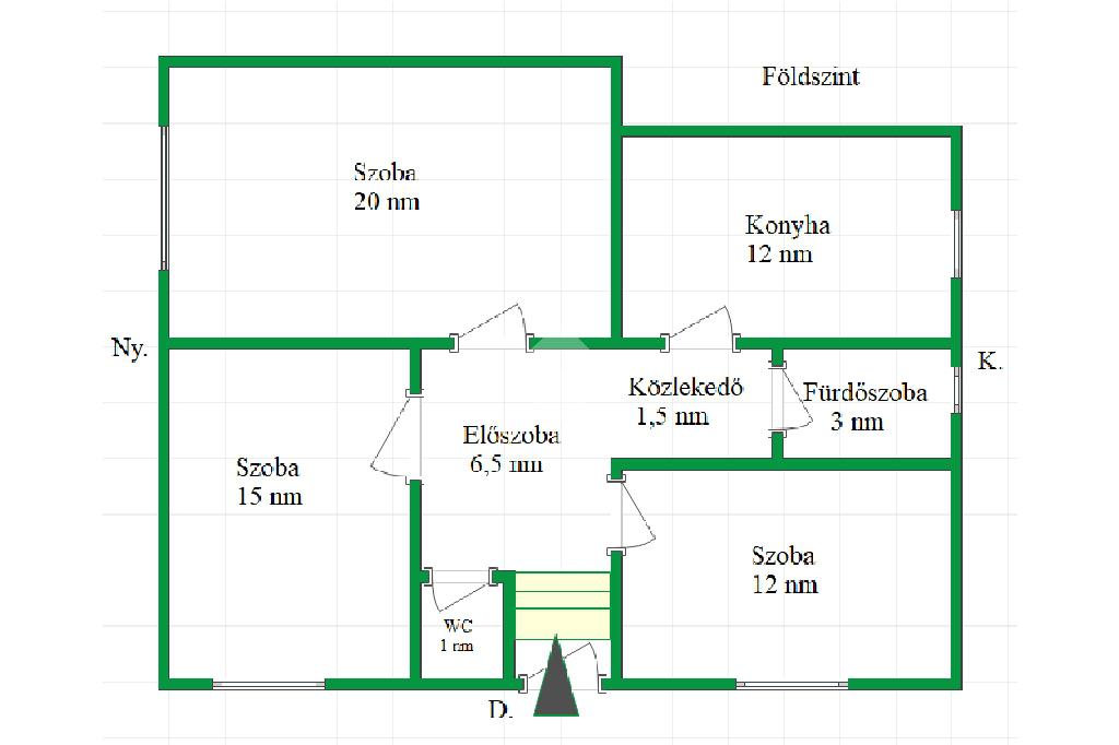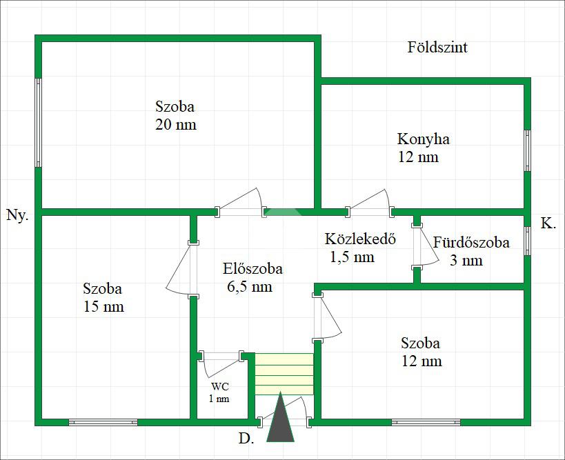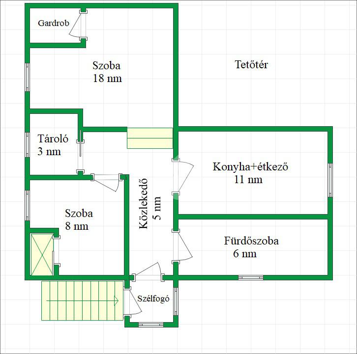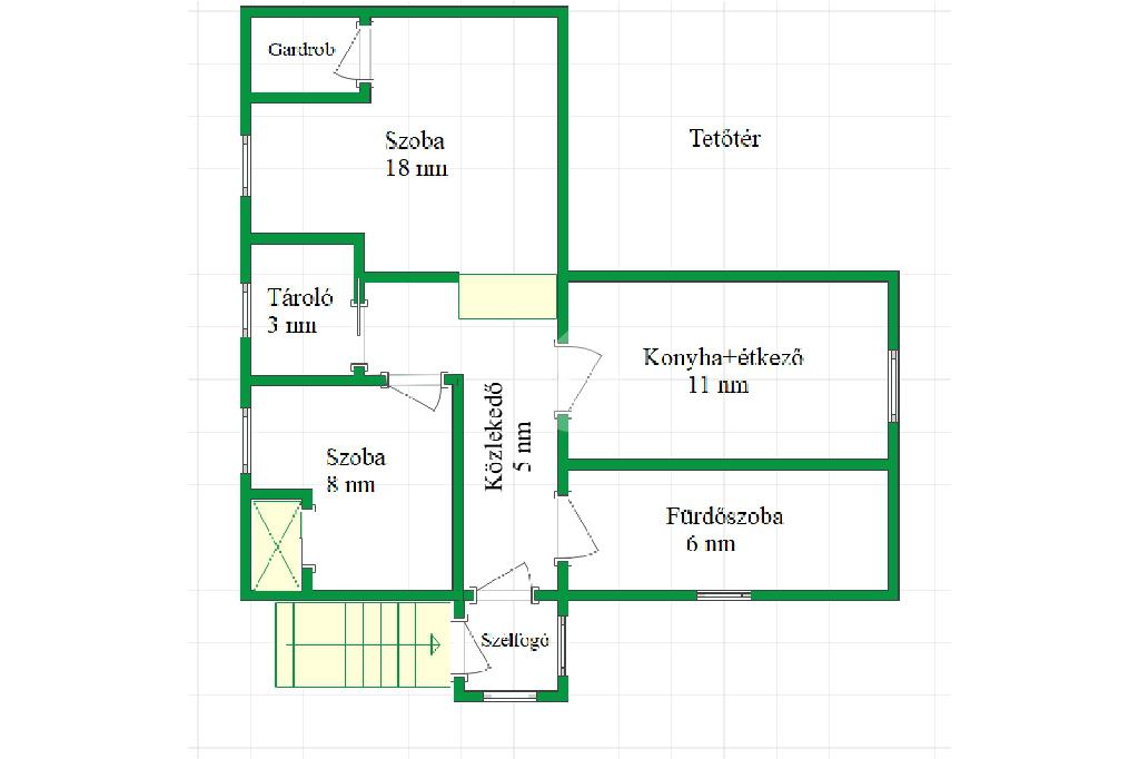 A földszinti lakrész 70 nm, 3 db szoba, konyha, fürdőszoba, előszoba és tároló található.
